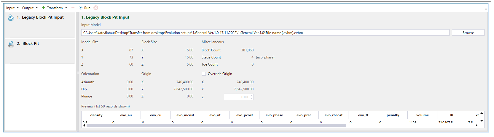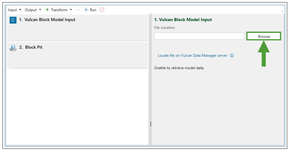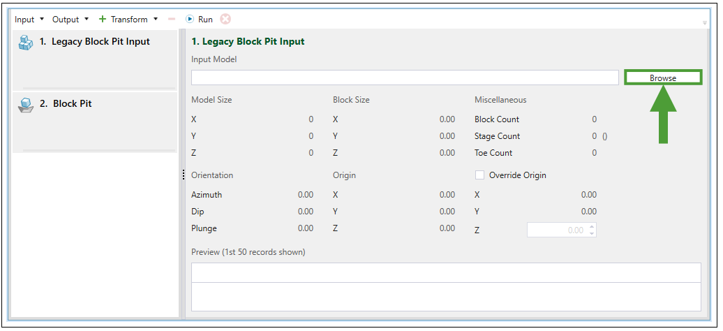 Once you have selected Legacy Block Pit Input from the Input drop-down menu, the Block Model Transform screen in your viewer will be changed accordingly. Click Browse to load the data from the Evolution block model file (.evbm) saved on your computer.