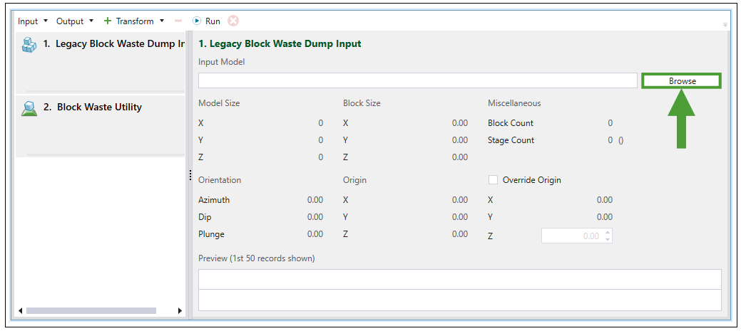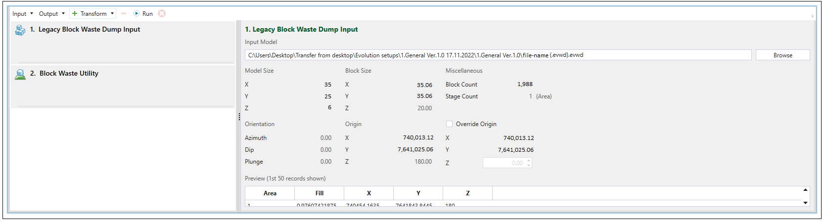 Once you have selected Legacy Block Waste Dump from the Input drop-down menu, the Block Model Transform screen in your viewer will be changed accordingly. Click Browse to load the data from the Evolution waste dump file (.evwd) saved on your computer.
