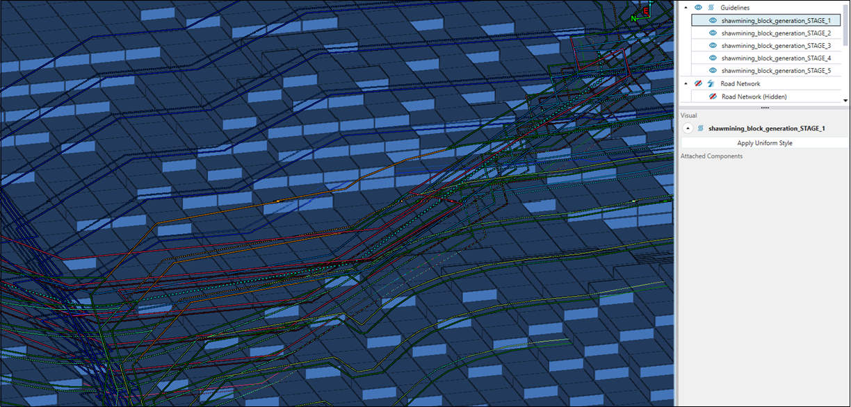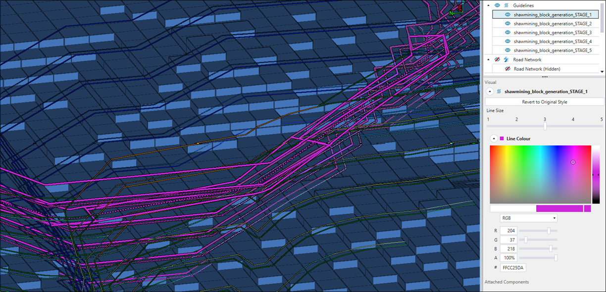 Evolution allows you to view Vulcan layers (linework) by dropping Vulcan design database (.dgd.isis) and Vulcan archive (.arch_d) files into the viewer. This creates guidelines that can help you decide where to make solid cuts (see Solid Cuts for more information). For example, if you have files with grade control polygons (marked out regions that group areas of similar grade), you can drop them into the viewer to identify which regions of the pit or on a certain bench should be scheduled.