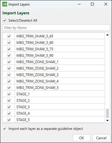 Choose which layers to import by selecting the corresponding checkboxes. The selected layers will be imported into Evolution as a single object, unless you select the Import each layer as a separate guideline object checkbox. In that case, Evolution will create an object for each imported layer, enabling you to customise the way each layer is displayed in the viewer.