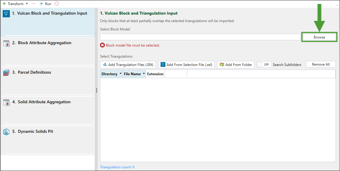 In the Vulcan Block and Triangulation Input panel, click Browse to select a Vulcan block model file (