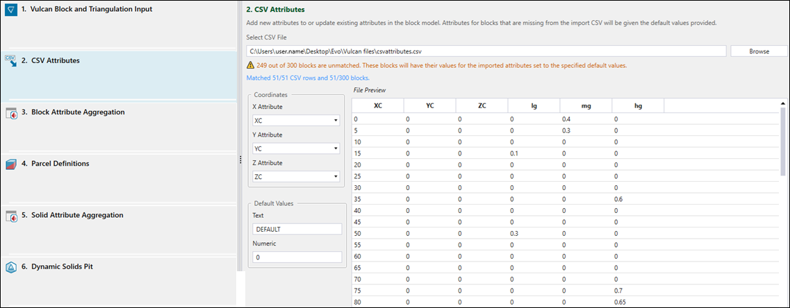 CSV Attributes to add new attributes or update existing ones in the block model.Note: Attributes for blocks that are missing from the imported CSV file will be assigned based on the default values that you provide in the CSV Attributes panel.