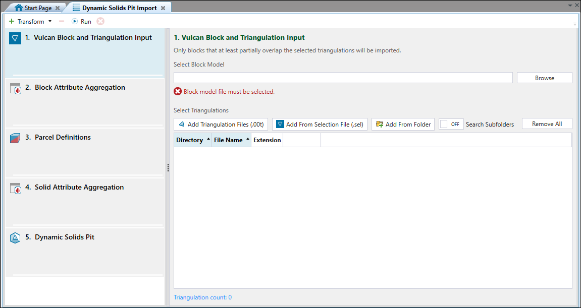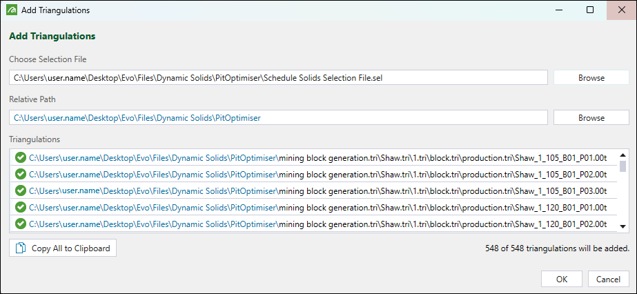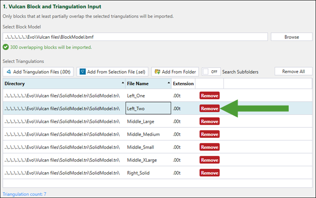 .selfile is located, as shown above. If the triangulations (.00t) files are located relative to a different folder, click the Browse button in the Relative Path and select the correct folder. This will change the blue parts of the triangulation paths.The triangulations will be loaded to the Vulcan Block and Triangulation Input panel.