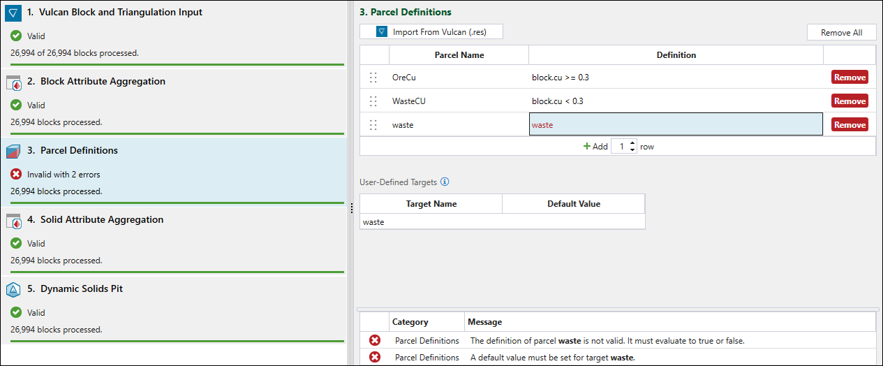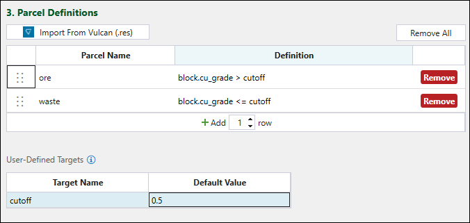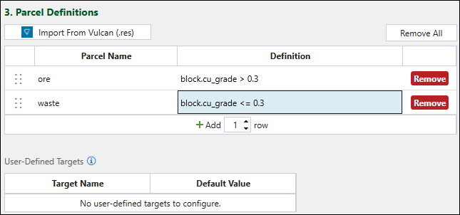 Evolution will check the definitions one by one starting from the top of your list and determine which parcel each block belongs to. If you leave the definition of your last parcel blank, all blocks that did not pass any other parcel definitions will automatically be assigned to it.You can also define custom targets among your parcel definitions. For each custom target that you use in a parcel definition, you must specify the Default Value in the User-Defined Targets table.