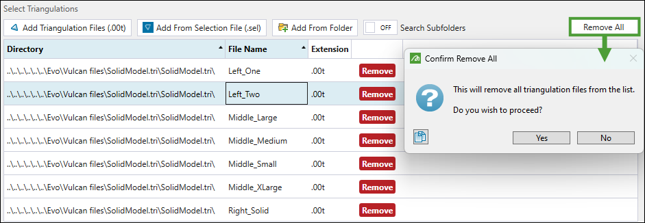 Tip: Click the arrow in the Directory and File Name column to sort the triangulation files alphabetically. This can help you identify the files to delete, especially when there are two solids with the same name but in different locations. Evolution uses the file name as the solid ID, so importing triangulation files with the same name is not possible.