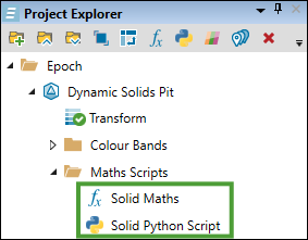 Maths Script to create attributes or to modify the existing ones in a model.Note: Maths scripts can only be run on the block component of the dynamic solids model during import process. You can create solid-only attributes after importing your dynamic solids pit. See Creating solid attributes using scripts for more information.