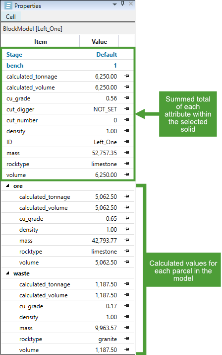 Note: The values are calculated based on the aggregation behaviour that you specified while importing the dynamic solids model. In the example above, cu_grade is a weighted average and rocktype is mode. See step 5 of the procedure for importing a dynamic solids pit.