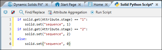 You can assign a mining sequence based on thestageattribute in your imported model and use the new attribute to sort solids in scheduling, using either of the solid scripting methods, as follows:Maths script