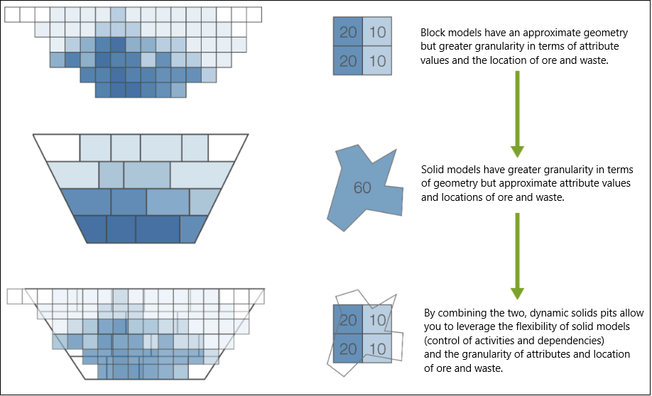 Dynamic solids pits are combinations of solid models and block models. These pits leverage the dependency generating capabilities of solid models combined with the enhanced fidelity of block models (see Block Models and Solid Models for more information).