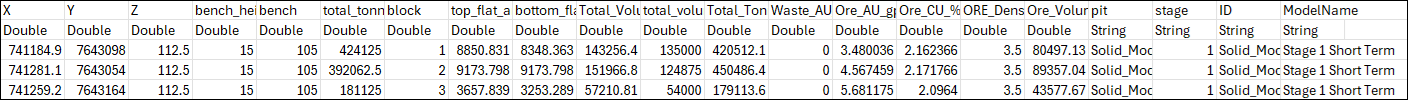 You can update solid pit and stockpile models in your project using a CSV file with the required information, formatted as shown in the image below.