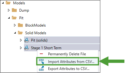 To update an existing solid pit or stockpile model with the required attributes, right-click on the model in the project explorer and select