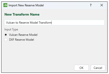 The Import New Reserve Model dialog window will appear. You can designate the name of the new transform to be created, and select the radio button corresponding to the desired input type. You can select from the following types: