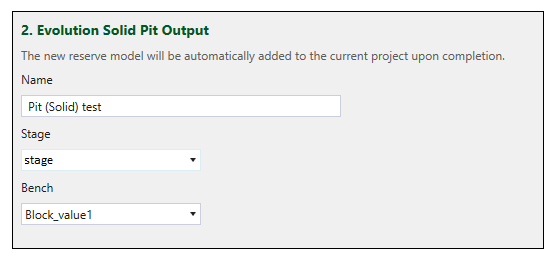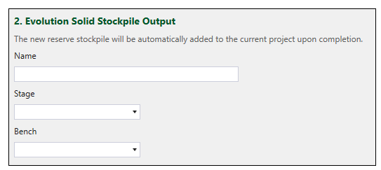 Solid Stockpile as an output, configure the Name, Stage, and Bench fields as appropriate.. The variables listed in the Stage and Bench drop-downs will be based on the data loaded from the input file and the filters you have applied with the