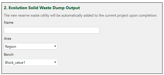 Solid Waste Dump as an output, configure the Name, Area, and Bench fields as appropriate. The variables listed in the Area and Bench drop-downs will be based on the data loaded from the input file and the filters you have applied with the