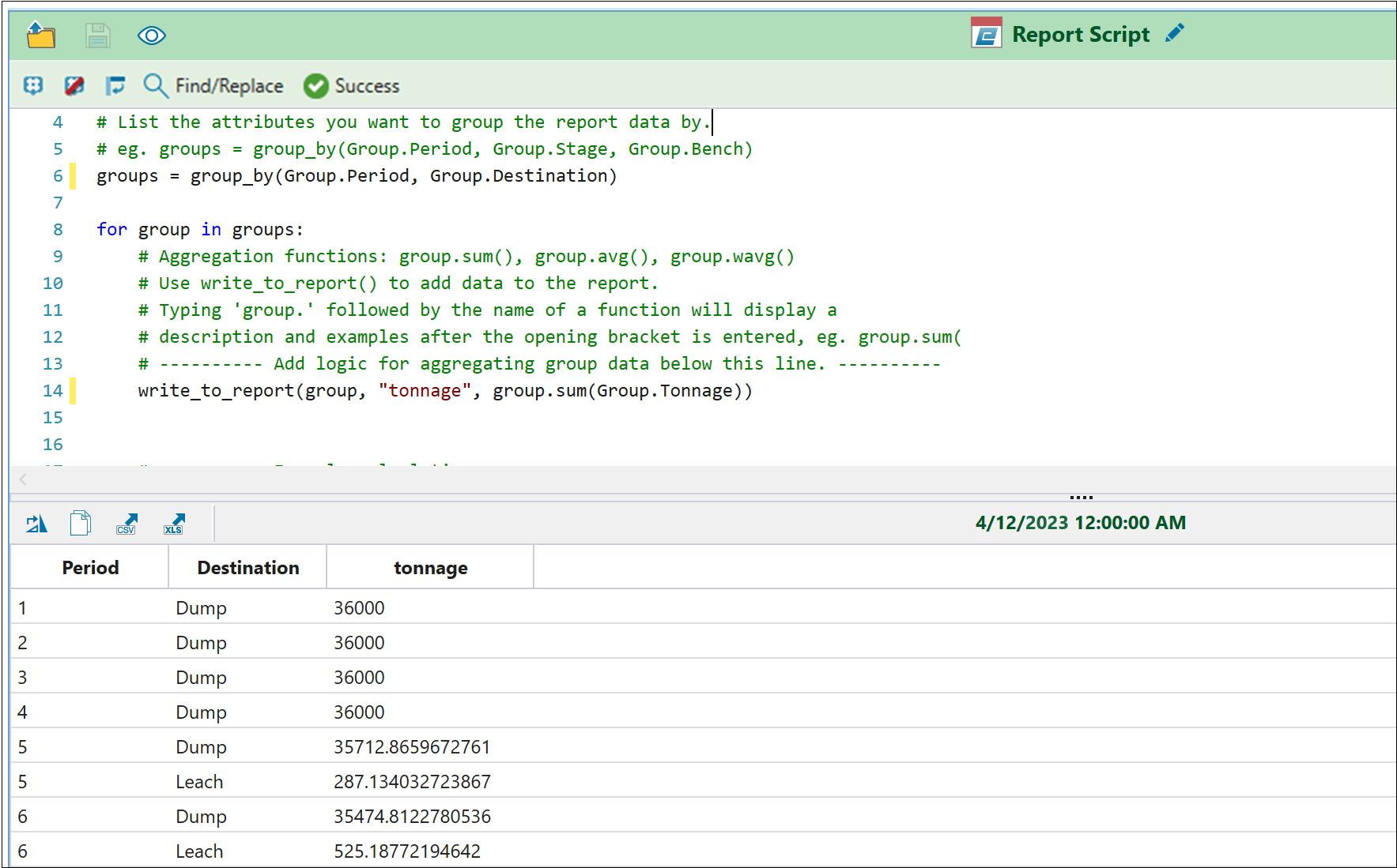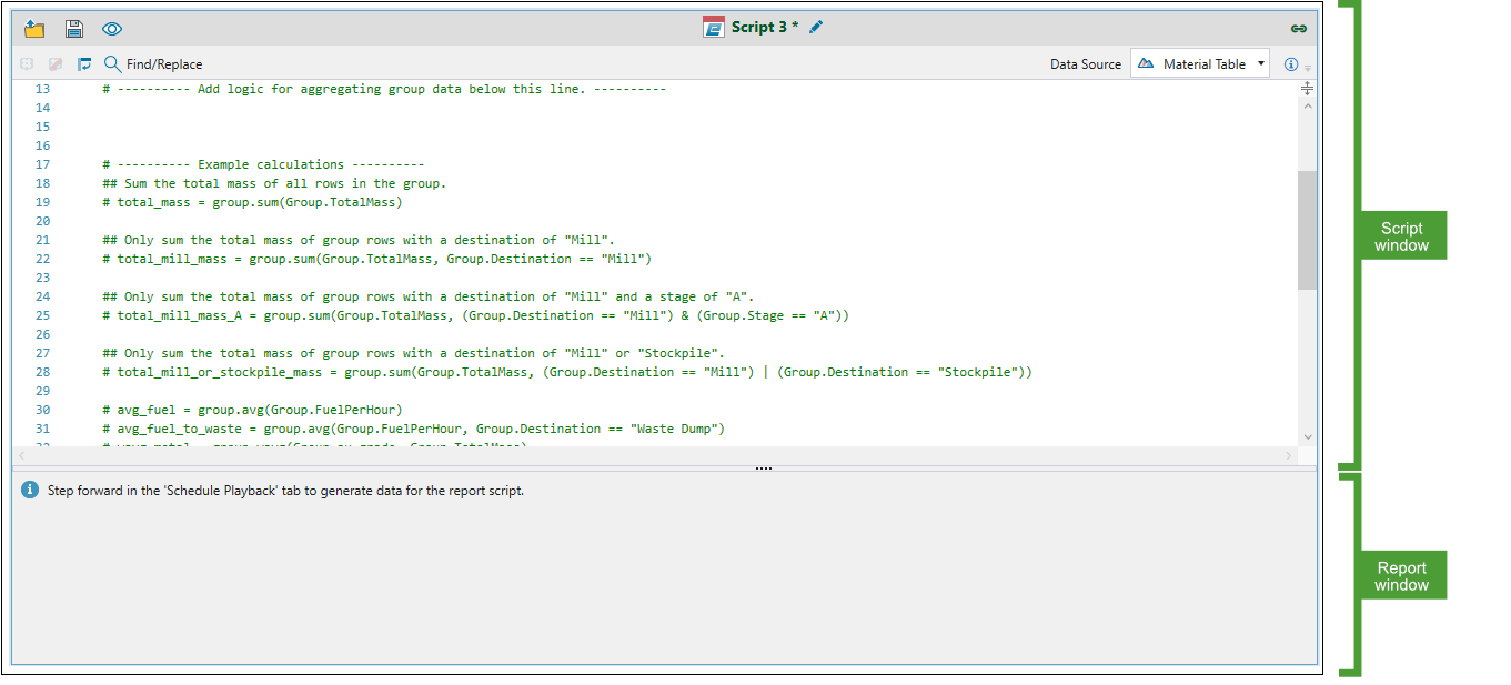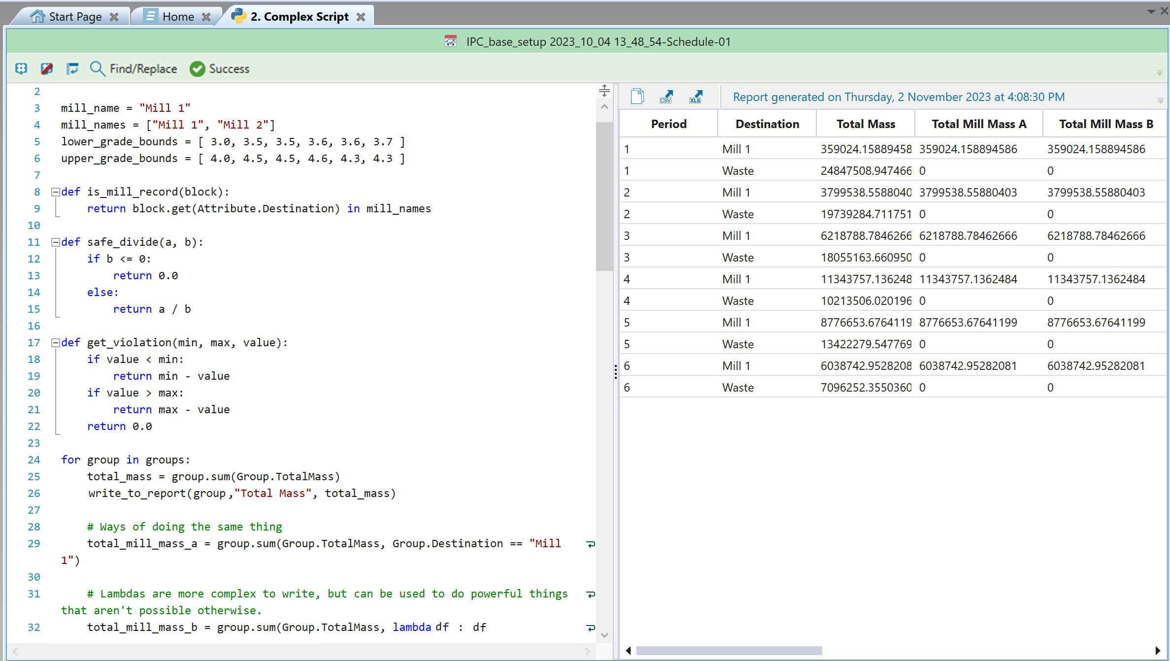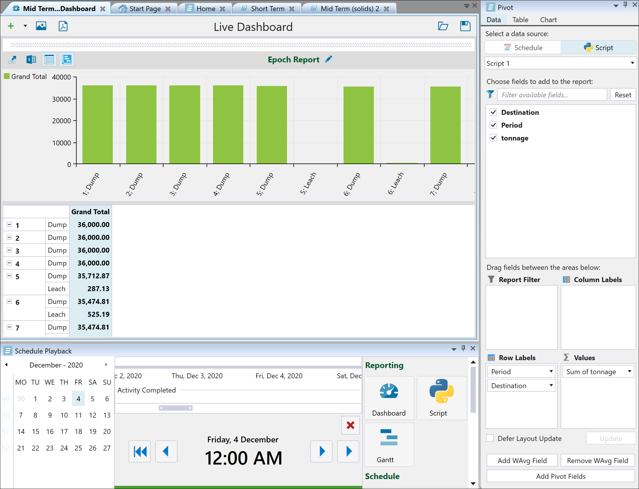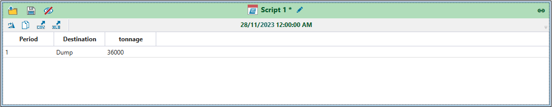 Python report scripting in Evolution allows you to create custom scripts to evaluate your schedules and build your reports. While pivot reports allow you to visualise your data in basic cases, Python report scripts make it possible to compile and generate reports for more complex mining scenarios. For more information on pivots, see Pivot Reporting.