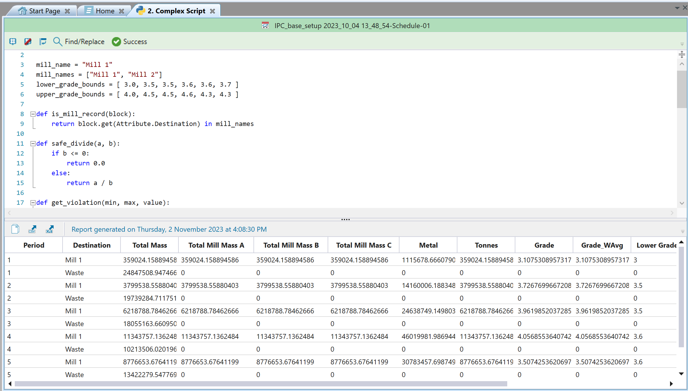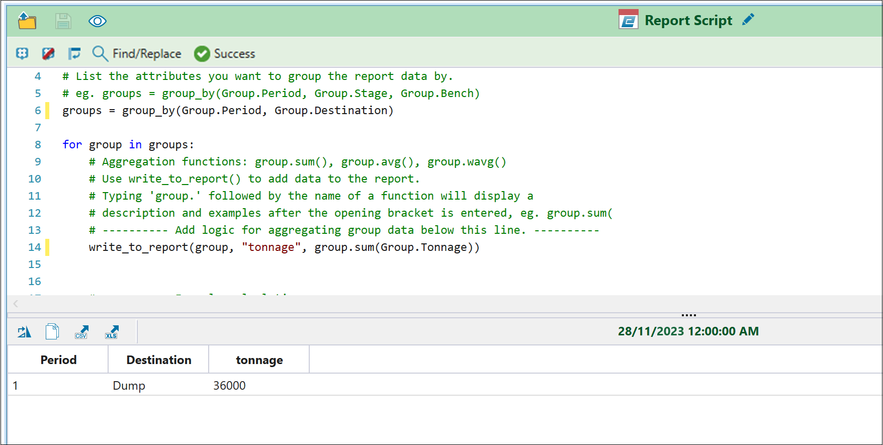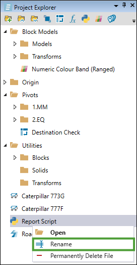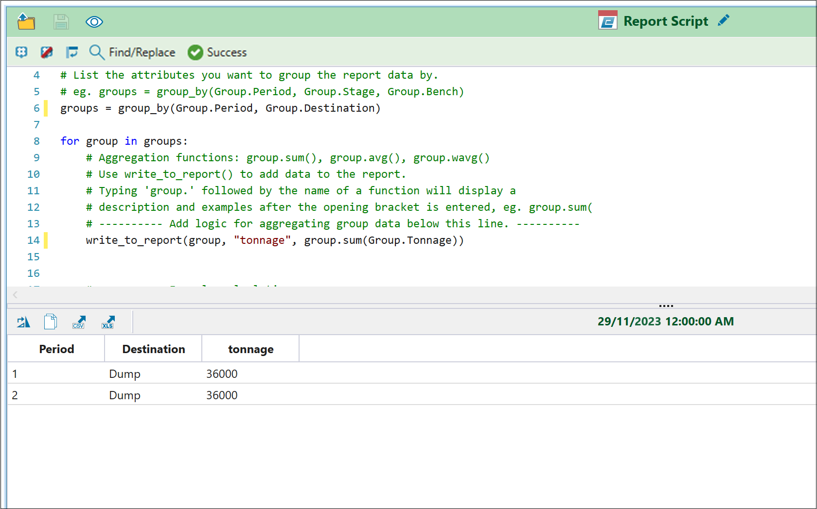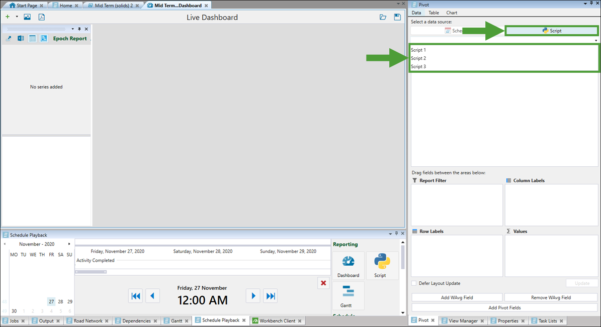 Python report scripting in Evolution allows you to create custom scripts to evaluate your schedules and build your reports. While pivot reports allow you to visualise your data in basic cases, Python report scripts make it possible to compile and generate reports for more complex mining scenarios. For more information on pivots, see Pivot Reporting.