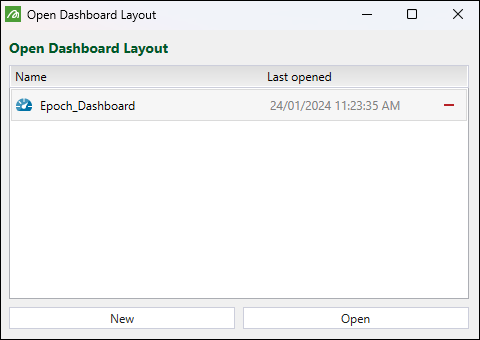 Open a previously created dashboard layout in the Open Dashboard Layout panel, or click New to create one.