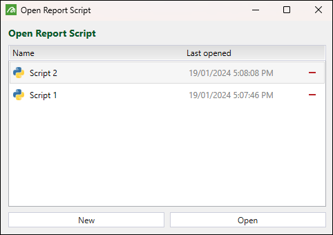 The Open Report Script panel will appear. You can open a previously created report script by selecting it from the list and clicking Open, or create a new script by clicking New. To delete a previously created script, click the