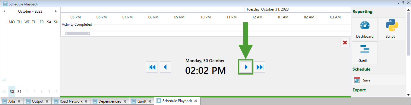 To display your output report, step forward in the Schedule Playback window by clicking the