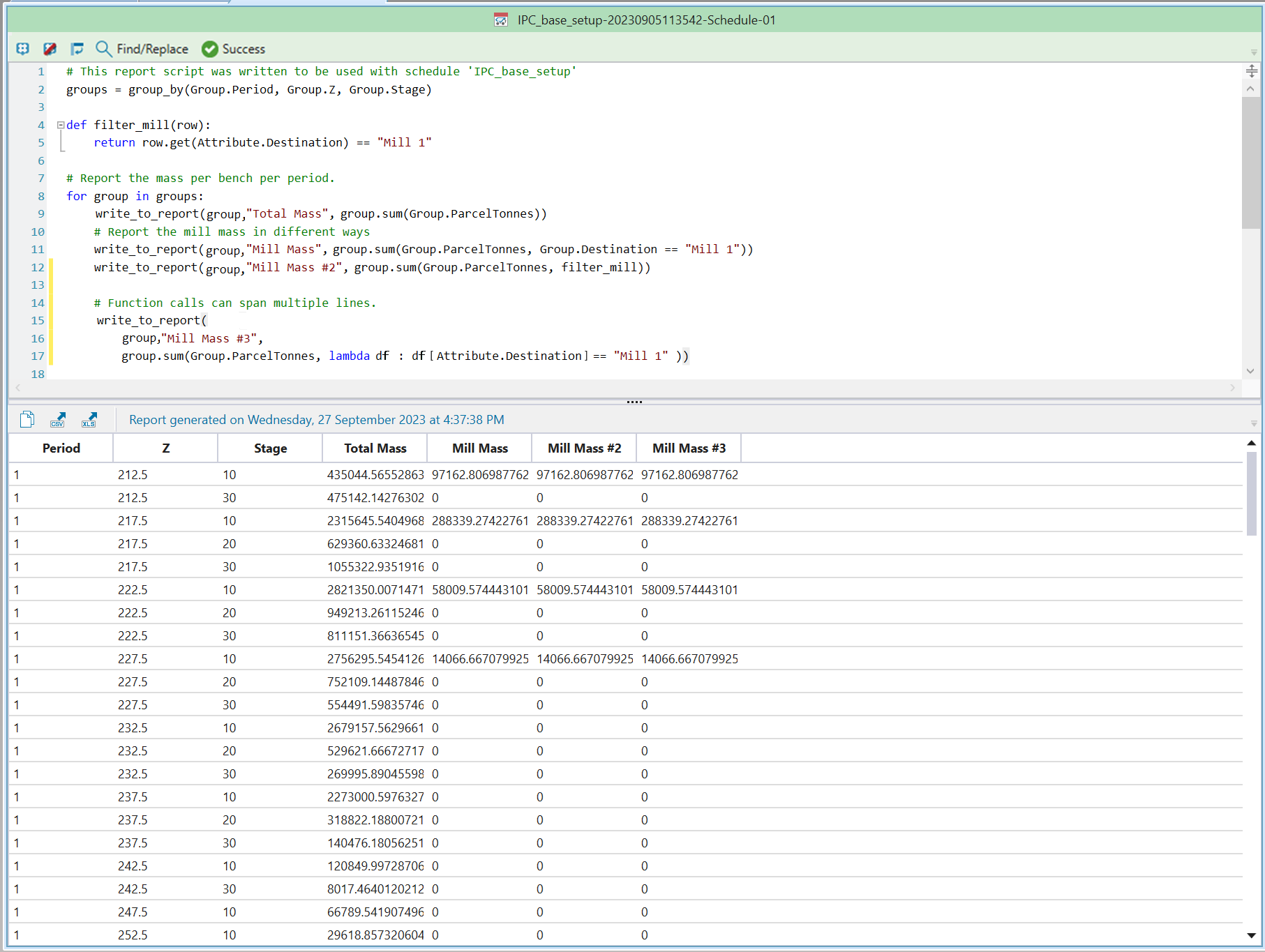 # Note that this syntax is a shortcut and can only be used for basic operations. If you want to use more complicated filtering logic, you will need to use one of the other two methods.write_to_report(group, "Mill Mass", group.sum(Group.ParcelTonnes, Group.Destination == "Mill 1"))