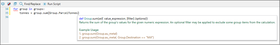 The python report scripts run over a series of groups and aggregate their values to write to a report, whereas the maths scripts run over individual blocks or solids and modify their attribute values. See Maths Scripts for Block Models for more information on maths scripts.