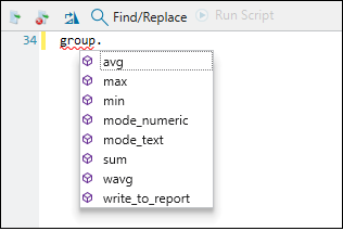 To facilitate the code input, a context-aware code completion feature named Intellisense has been implemented in the report script editor. Once you start inputting a name of a function in the script window, a list of suggested function names will be displayed for you to select.