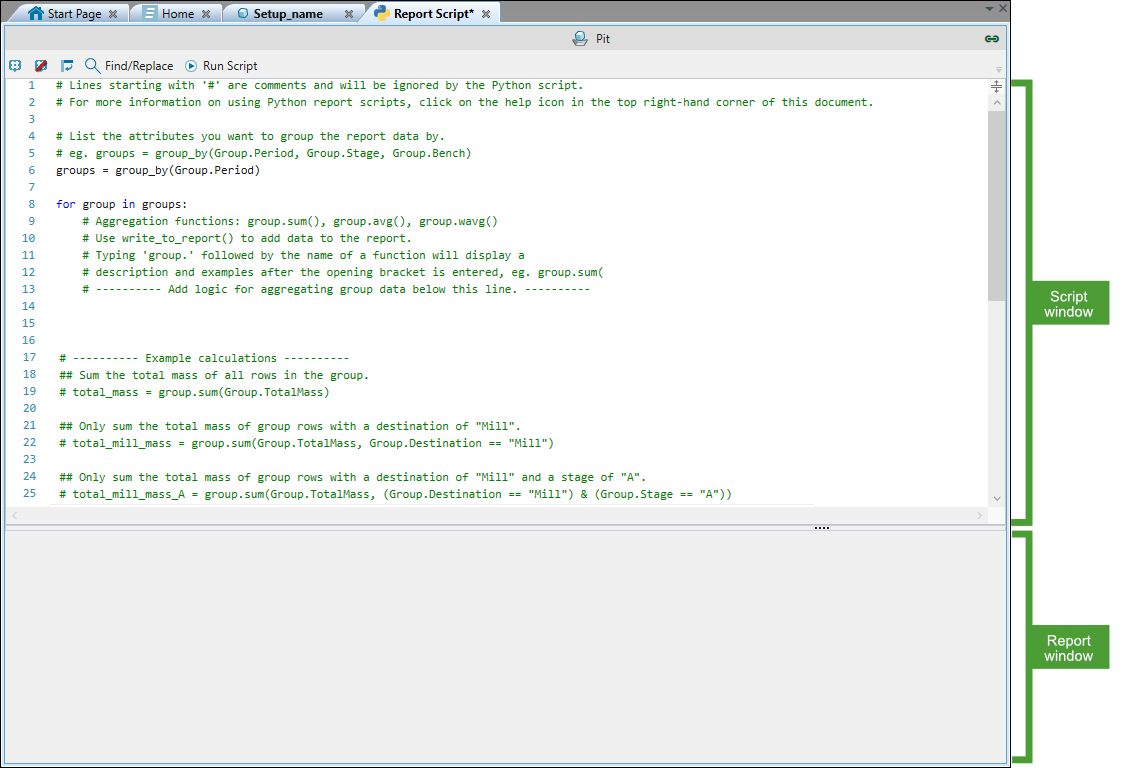 The script report screen is divided into two parts: the Script window (where you can apply your script), and the Report window (where the output for your report will be shown).