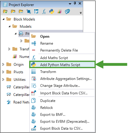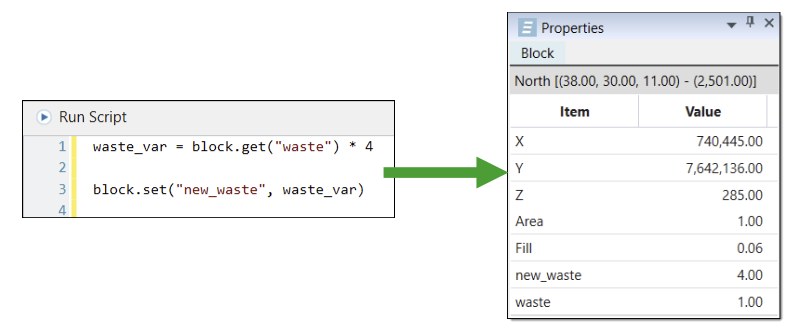Evolution allows you to create Python scripts for both block and solids models. Python scripts work similarly to regular maths scripts, however, they offer you a greater range of functions, such as loops and if conditions. Python also contains the get and set functions, which allow you to specify and set attributes in your model. After writing the desired script, you can prompt Evolution to run the script over each block in the model. You can also create customised report scripts in Python. See Python Report Scripting for more information.