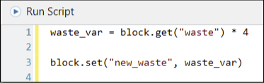 The following image displays an example Python script, where we have used a get function to get the attribute waste from the model. We multiply the waste column values by four and assign the result to the variable waste_var. We then set a new attribute, new_waste, to the values of the variable waste_var, using the set function.