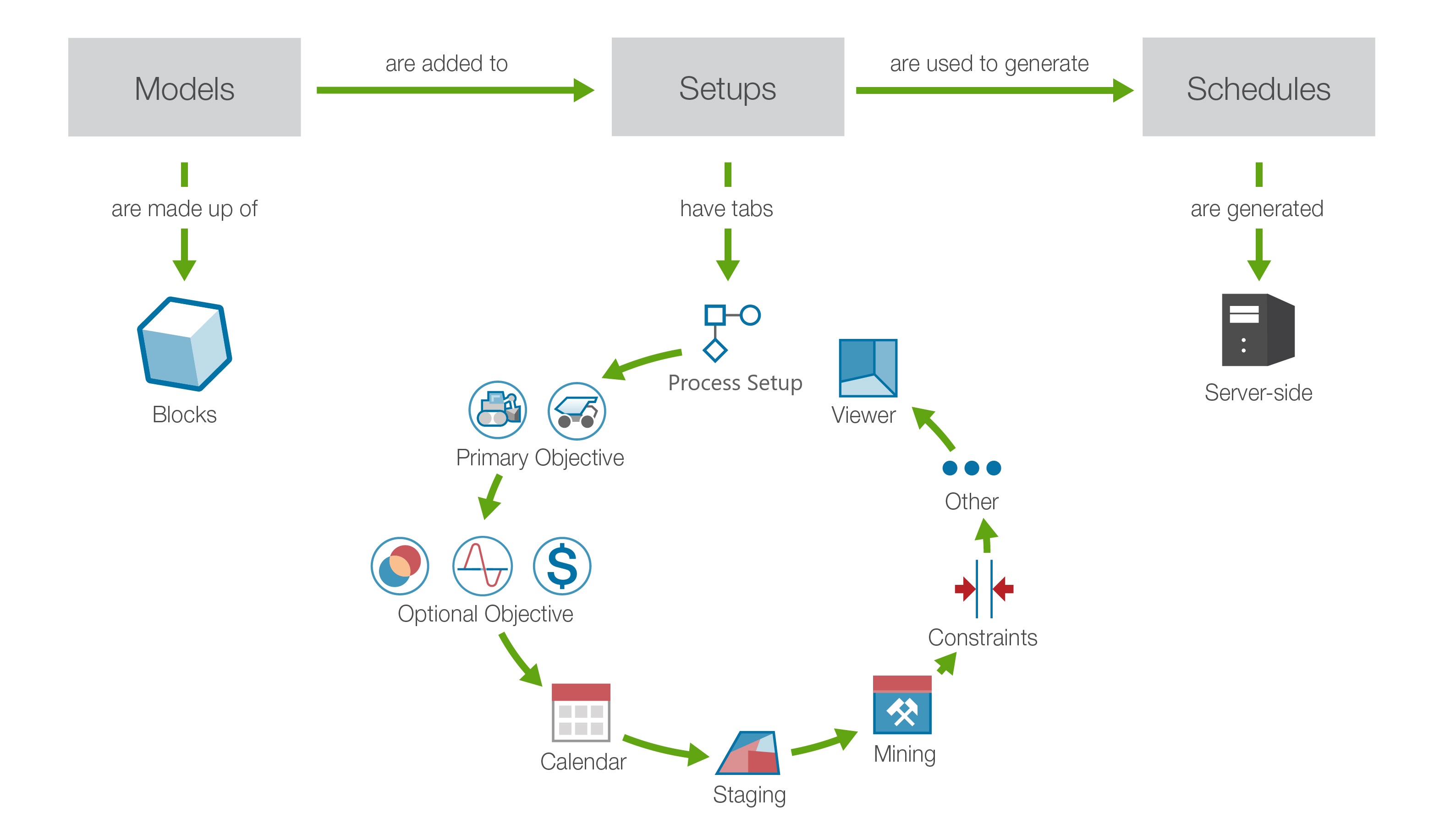 The Origin Blocks Workflow establishes the key steps to set up and analyse your medium-term schedule. To get started, you can click on the steps below: