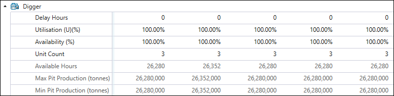 For each digger fleet you add, specify the Delay Hours, Utilisation, Availability, and Unit Count (the number of diggers in the fleet).