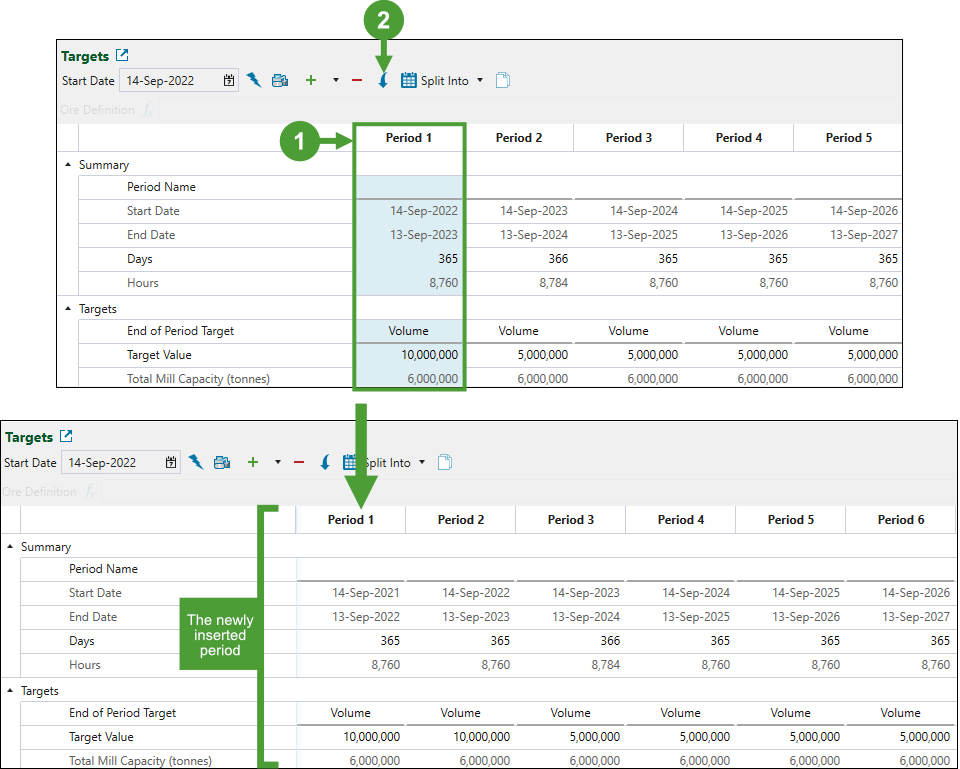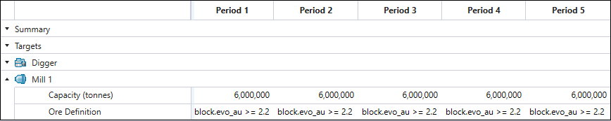 Targets subtab to define parameters for each period in the production cycle. You can specify the per-period targets and target values for each processing node, stockpile, and equipment in your setup.
