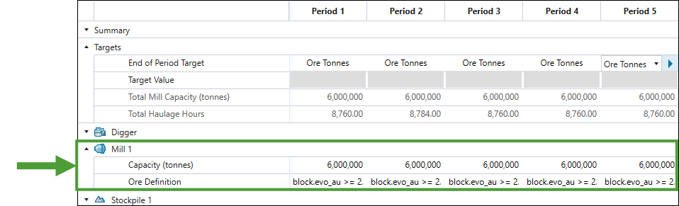 For each mill in your setup, set the per-period capacity and ore definition. The ore definition dictates the type of material that can be sent to it.