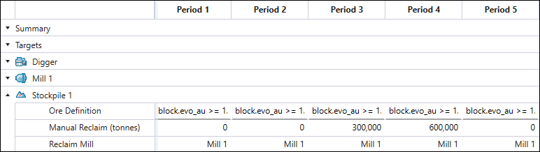 Note: If a mill has an overflow stockpile enabled, then any ore matching that mill’s ore definition in excess of its capacity in a given period will be sent to that stockpile. In the following periods, if there is not enough pit material passing the mill’s ore definition to meet the target capacity, ore will be automatically reclaimed from the stockpile, unless there are not enough truck hours available in the end of period target that you have set. If you want to give Origin a better chance to meet mill targets, you need to ensure that the mills have overflow stockpiles, and that their ore definitions are broad enough that there is a surplus of material to build them up.