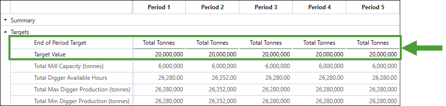 Total Tonnes. The returned schedule will end the period once the total tonnes of ore and waste excavated from the pit and reclaimed from stockpiles in a given period meet the value that you set in the Target Value field.