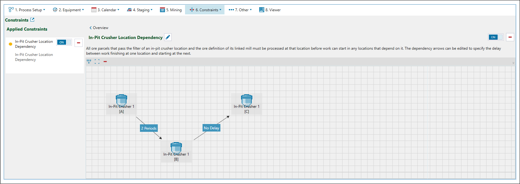 Use the In-Pit Crusher Location Dependency constraint to specify stage dependencies between in-pit crushers. All ore parcels that pass the filter of an in-pit crusher location and the ore definition of its linked mill must be processed at that location before work can start in any locations that depend on it. In-pit crusher locations are set in the