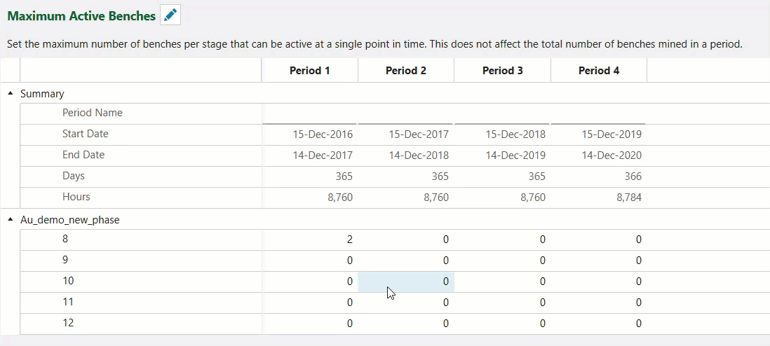 In the image below, we are editing the maximum active benches in stage 8 of the pit Au_demo_new_phase in Period 1. This means that the maximum number of benches that can be mined at the same time in Period 1 of Stage 8 is 3.