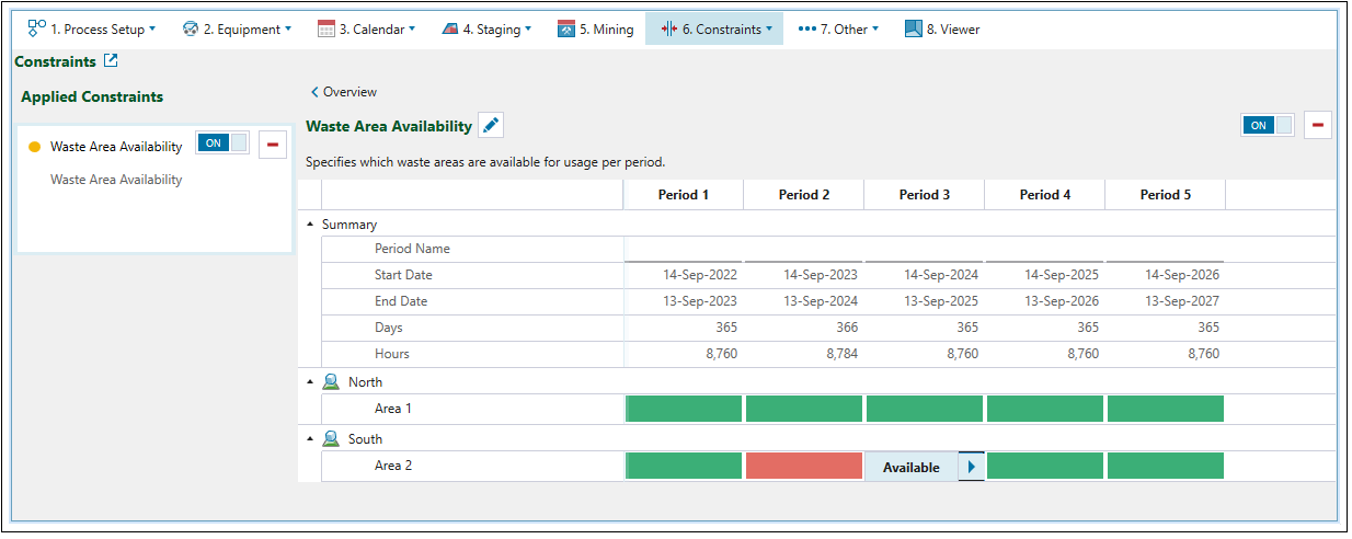 Use the Waste Area Availability constraint to specify when an area in a waste utility is available for dumping on a per-period basis.