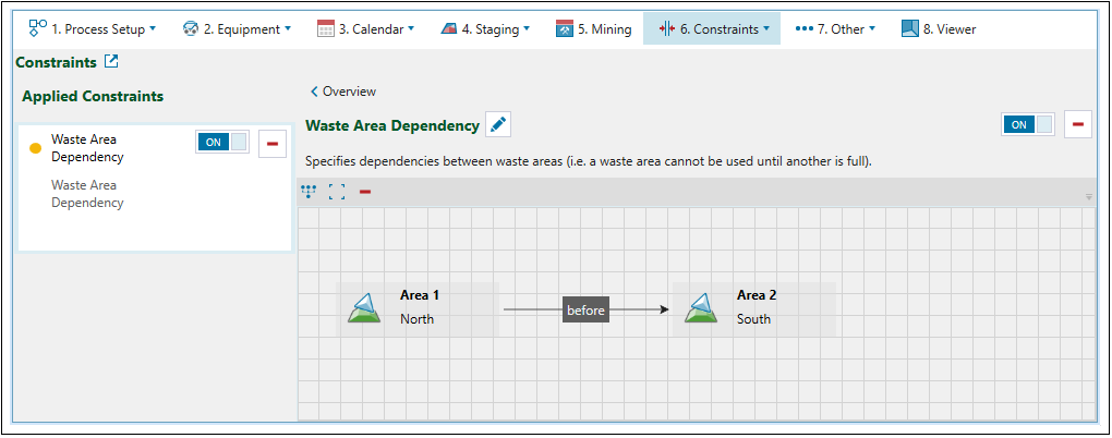 Use the Waste Area Dependency constraint to specify dependencies between waste areas.