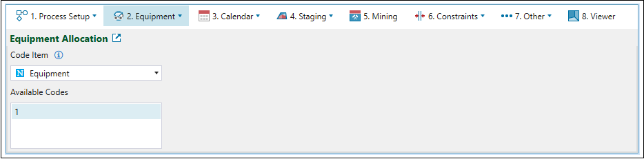 Equipment Allocation subtab, you can add codes to your setup by choosing a variable from the Code Item drop-down. The variables listed in the drop-down correspond to your model's data set. These codes are used to represent different lithology types or stages.