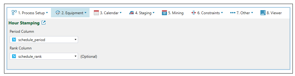 Equipment tab to specify the type of equipment used in the mining process, its parameters, and operational characteristics.