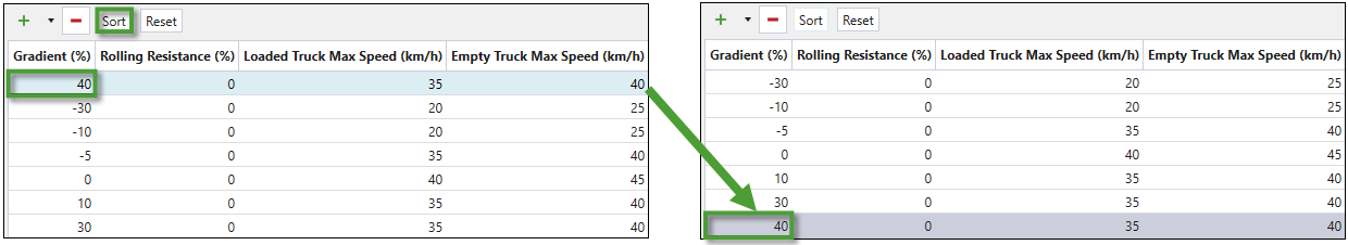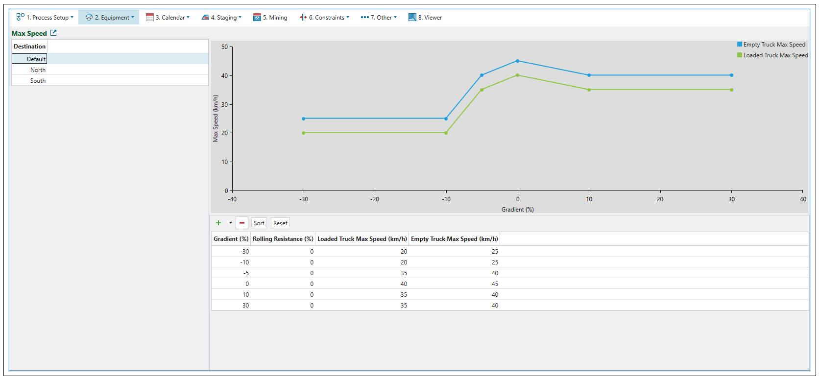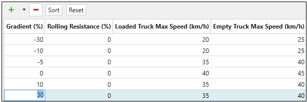 Max Speed subtab is used to plot the unloaded and loaded maximum truck speeds against the road gradient. All points in the graph are editable. Values from the graph will be used to calculate travel time when the setup contains a road network.