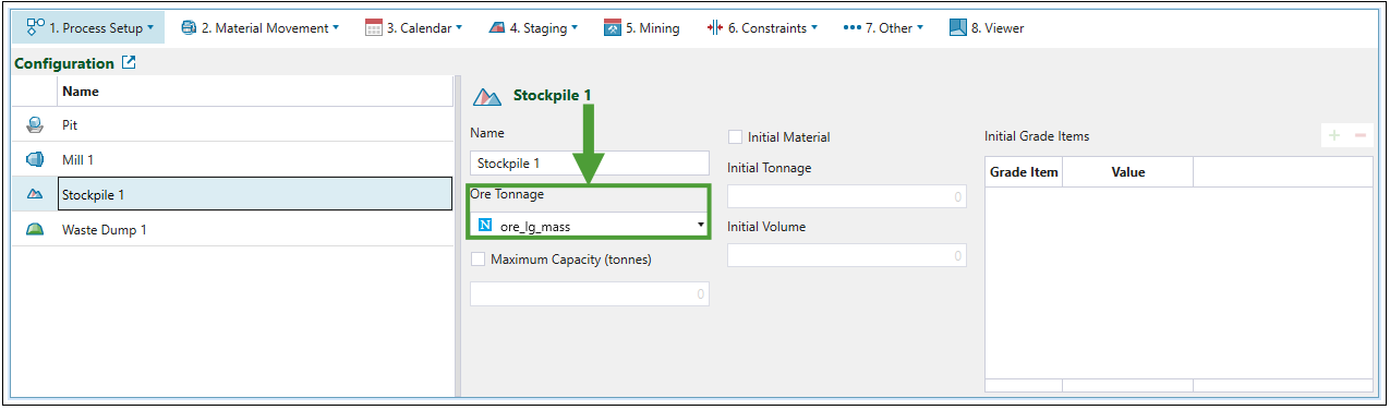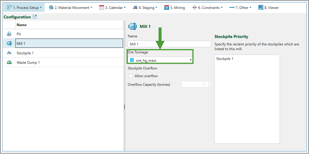 Configuration subtab and set the Ore Tonnage for the mill and stockpile consecutively as ore_hg_mass and ore_lg_mass.Mill configuration setting