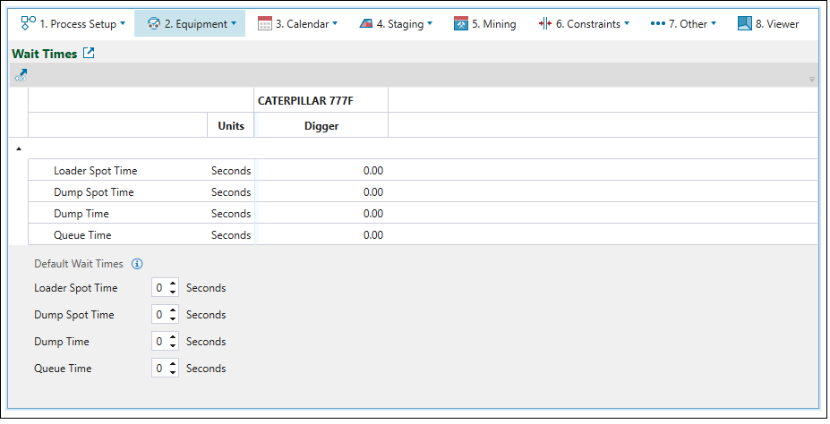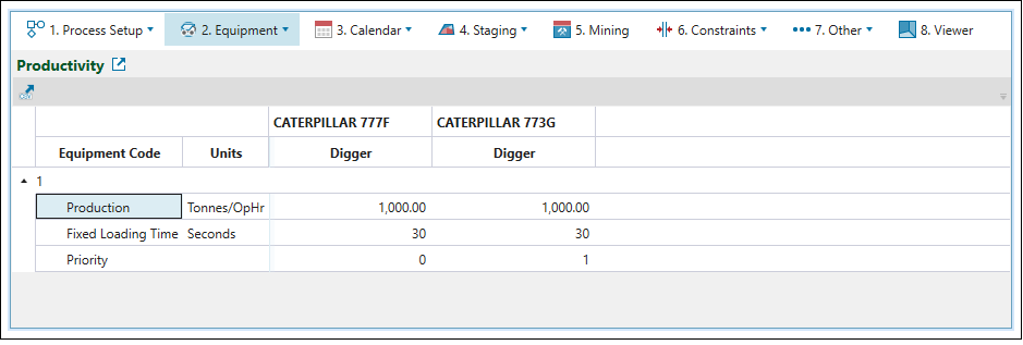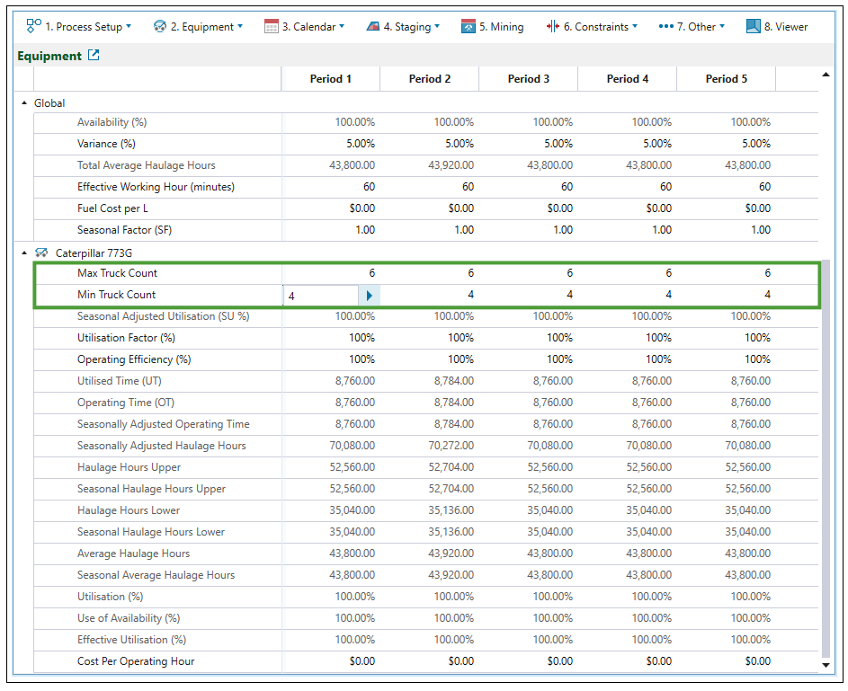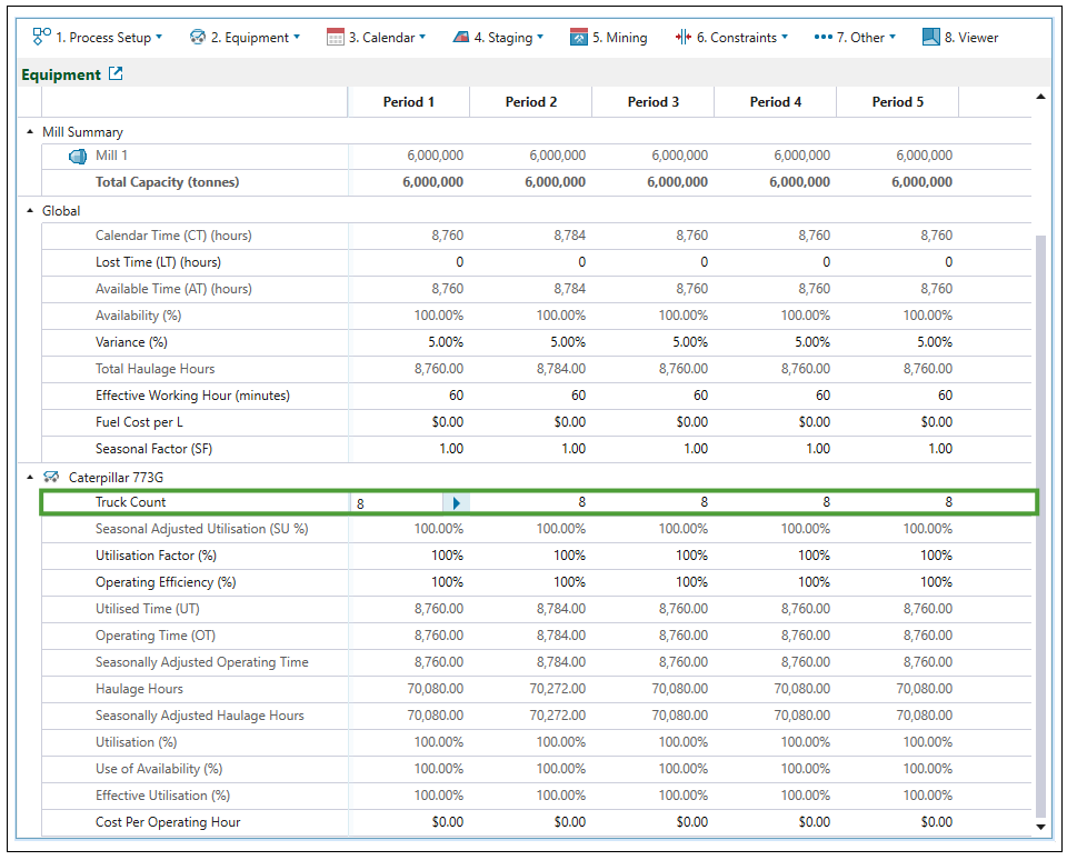 Note: See Targets to set the number, utilisation, and availability of diggers in each period. To set the number, operating efficiency, and utilisation factor of each truck type in your setup, go to the Equipment subtab of the