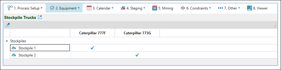 Stockpile Trucks subtab to assign the trucks that are allowed to reclaim from each stockpile.