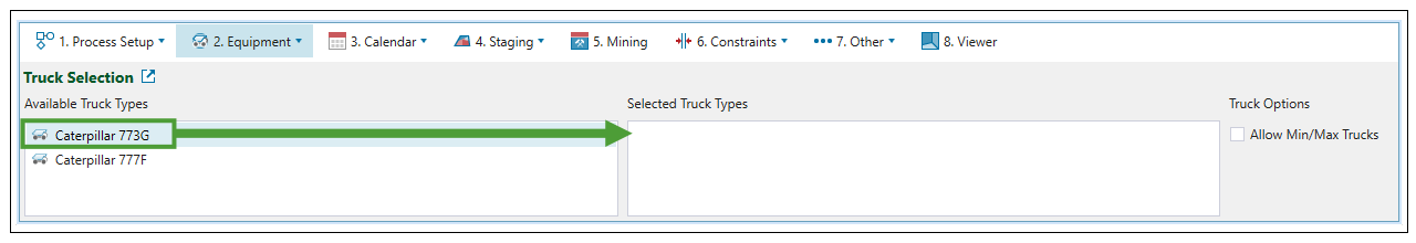 Truck Selection subtab to add truck types defined in your project to your setup. To configure a new truck for the project, see Creating Trucks.