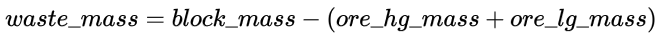 Evolution will calculate the waste mass in each block by subtracting the total mass of all ore parcels from the total block mass, according to the following formula: