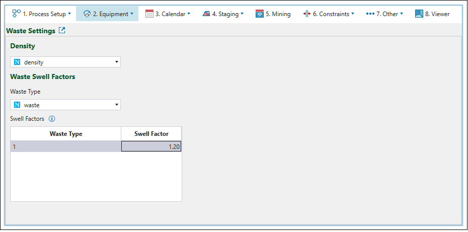 Waste Settings subtab, select the variables corresponding to the density and waste from each drop-down menu. You can specify the swell factor manually by double-clicking the corresponding cell in the table and entering the value manually.