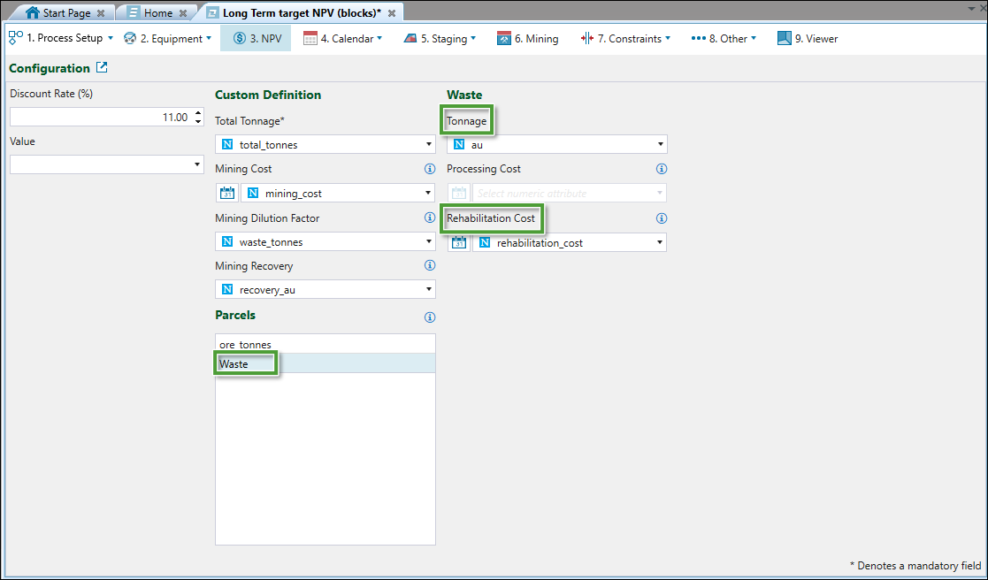Note: Only the Tonnage and Rehabilitation Cost variables need to be specified when the Waste parcel is selected.