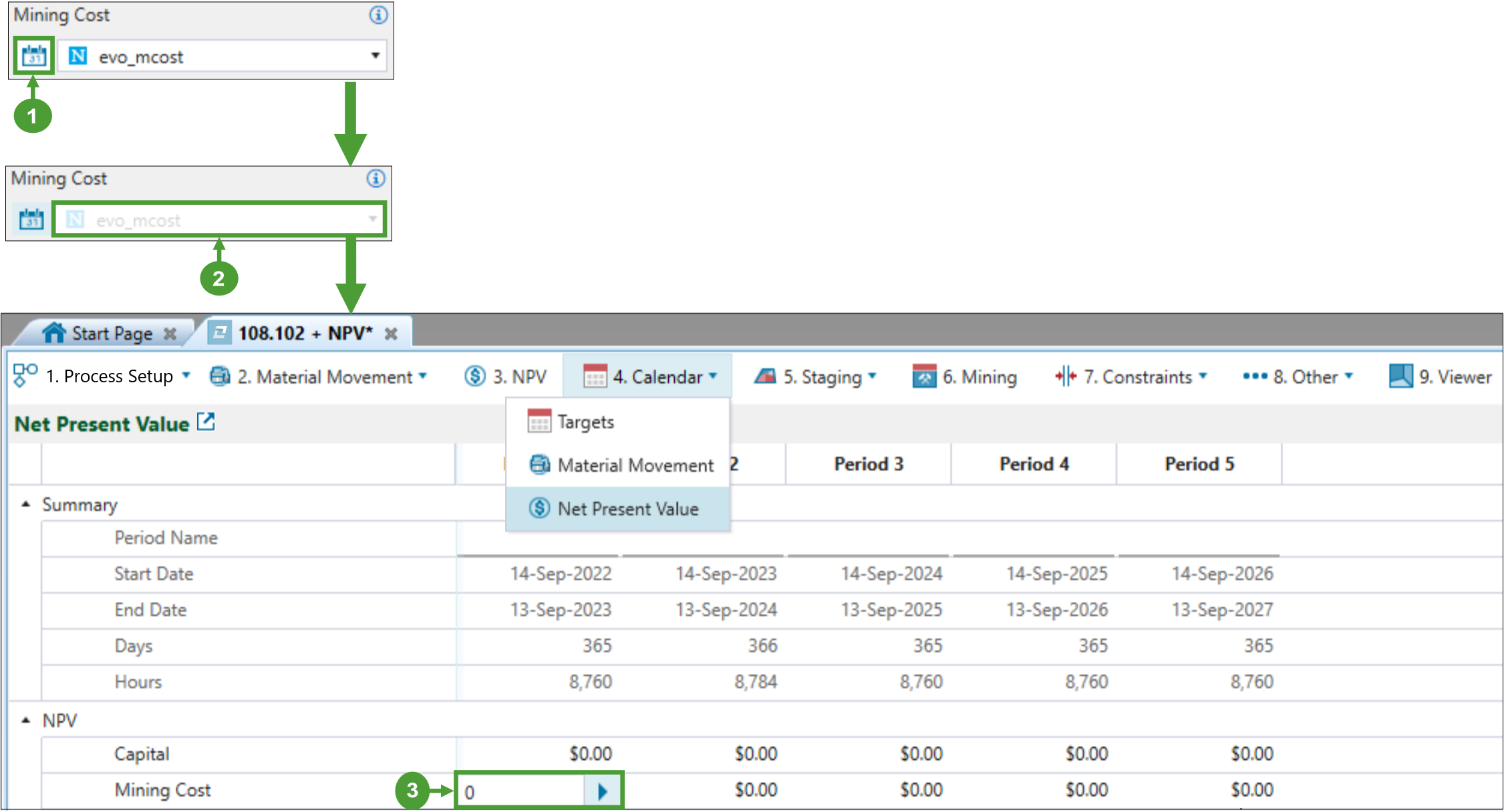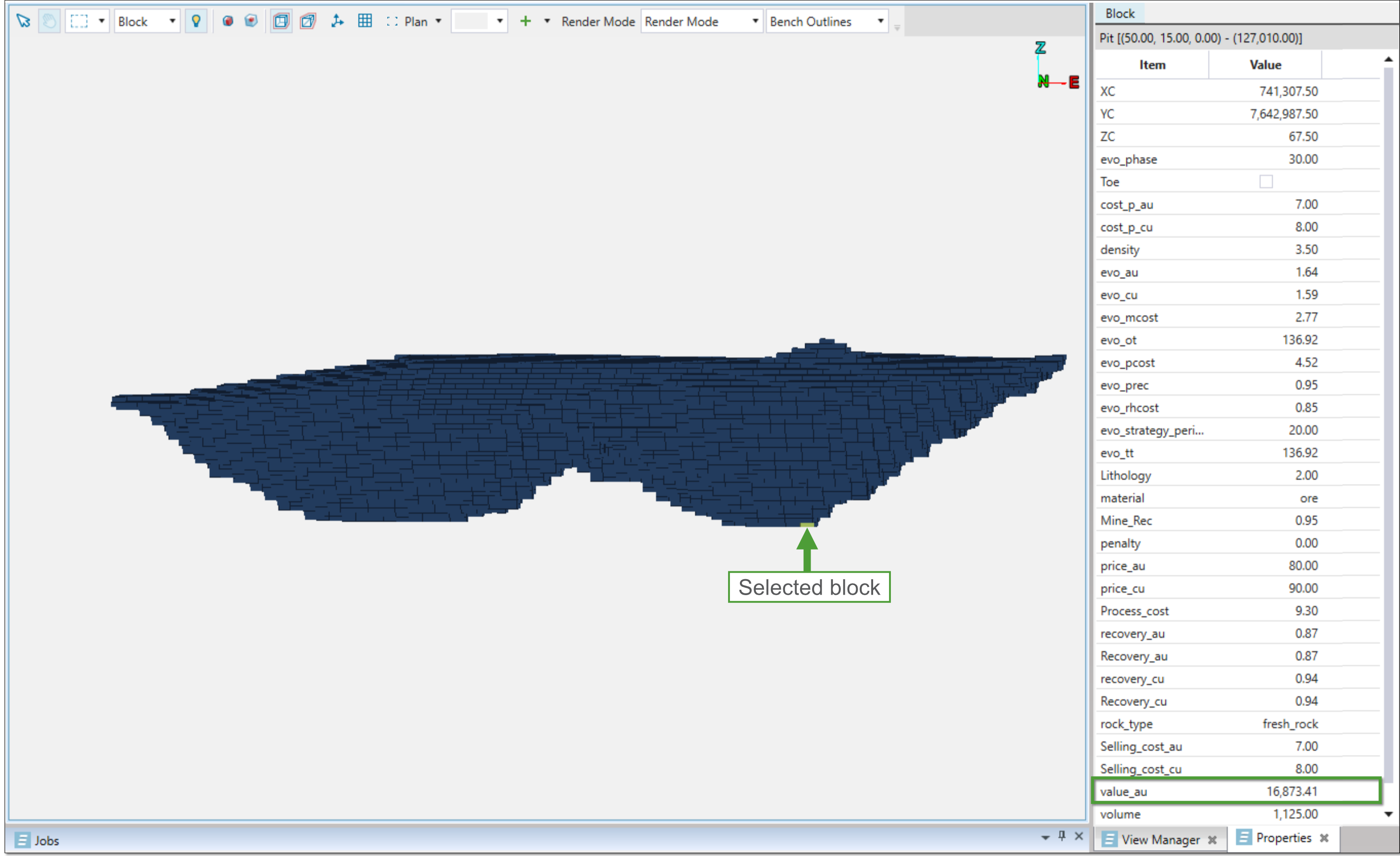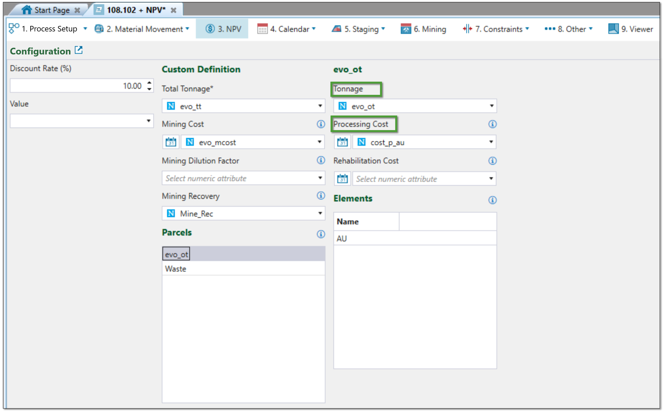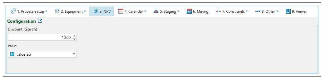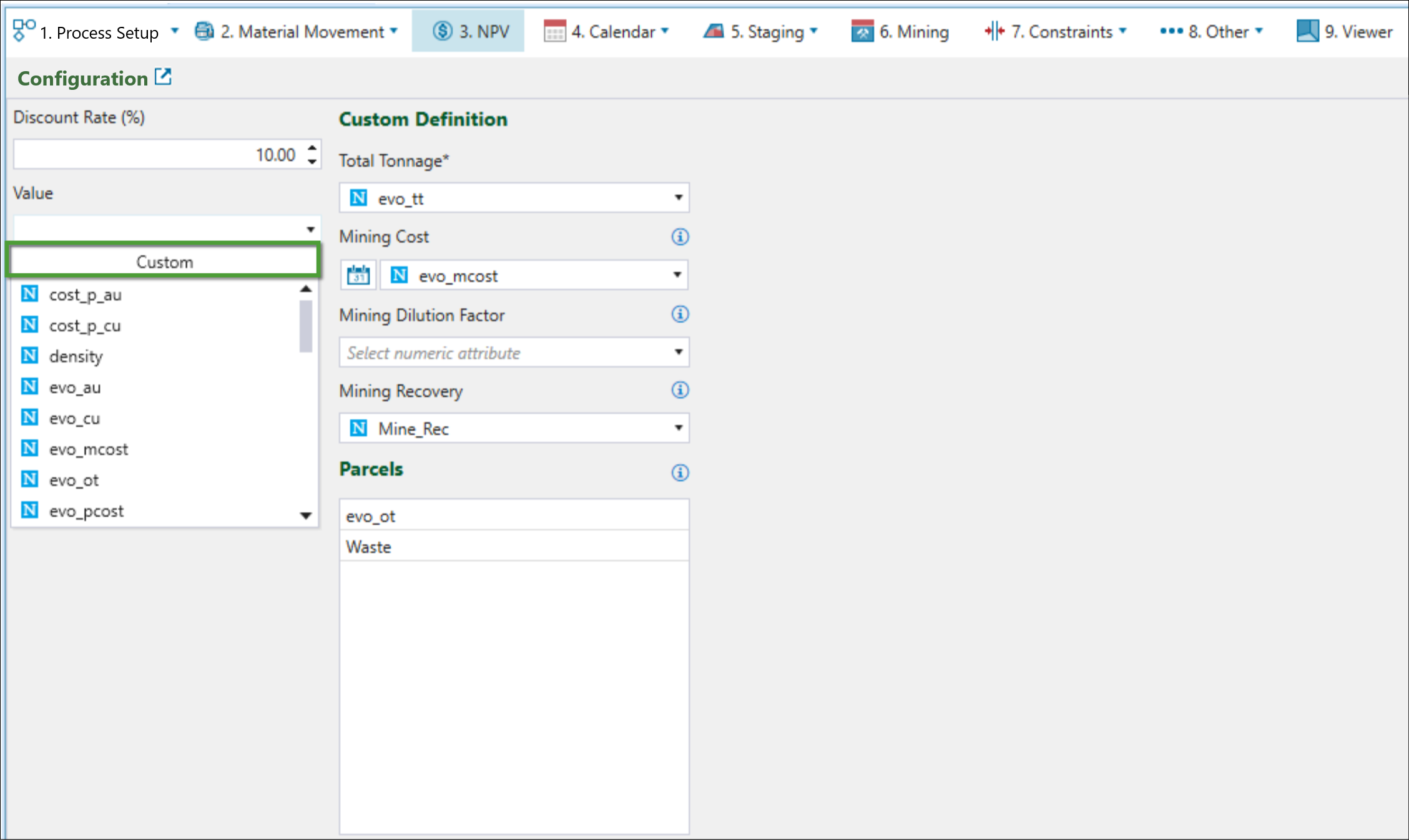 The requirement to set up the basic NPV Objective is to code the block model with the block value generated. The block model item is then selected from the drop-down settings window for Value, along with the entry of the Discount Rate (%) to apply.